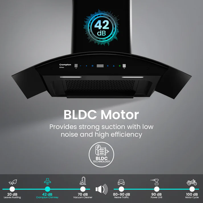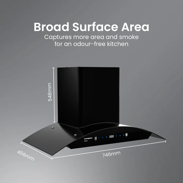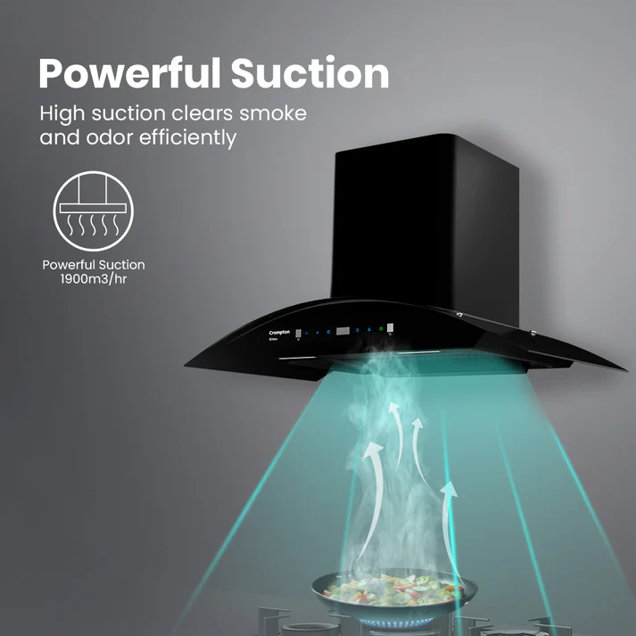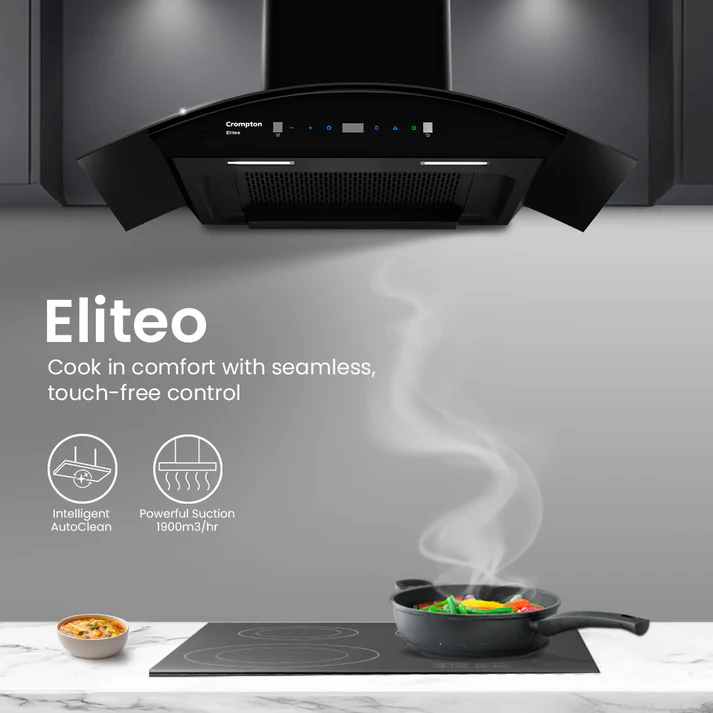 Upgrade your kitchen with the Crompton Eliteo Chimney, built for effortless performance and modern convenience. Its Intelligent AutoClean function saves you the hassle of frequent cleaning, while Smart On and Gesture Control make operation completely hands-free and intuitive.