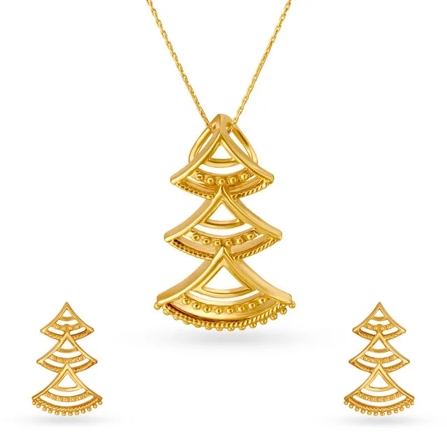 Add a touch of radiance to your jewellery collection with this beautifully crafted 22K gold pendant and earrings set. The design features an elegant teardrop frame with a delicate floral motif at the center, blending traditional artistry with contemporary charm. Perfect for daily wear as well as festive occasions, this lightweight set complements sarees, ethnic wear, and modern outfits alike. Whether you’re looking for a thoughtful gift or a classic addition to your own collection, this floral teardrop gold set makes a graceful statement.